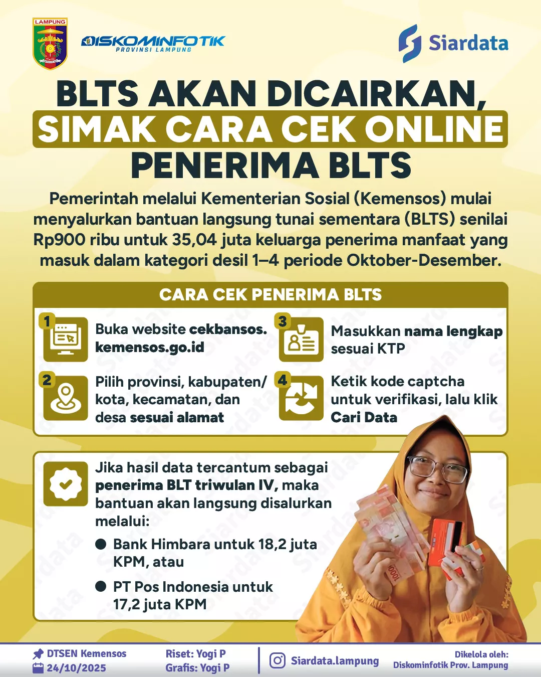 PODIUM, BANDARLAMPUNG, -Pemerintah melalui Kementerian Sosial (Kemensos) mulai menyalurkan Bantuan Langsung Tunai Sementara (BLTS) bagi 35,04 juta keluarga penerima manfaat untuk periode Oktober–Desember 2025.