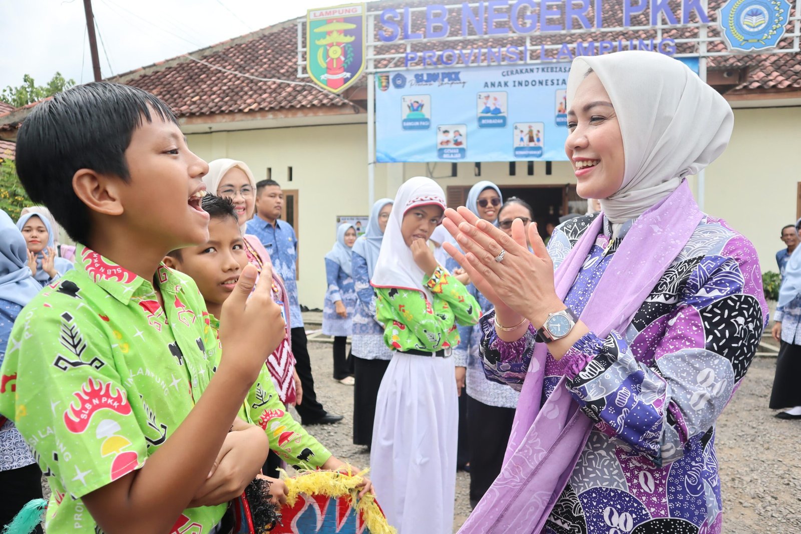 Kedatangan Purnama Wulan Sari Mirza disambut hangat dan penuh antusias oleh para siswa SLBN PKK Provinsi Lampung. Senyum dan semangat terpancar dari wajah anak-anak istimewa tersebut, mencerminkan rasa percaya diri dan kebanggaan atas kemampuan yang mereka miliki.