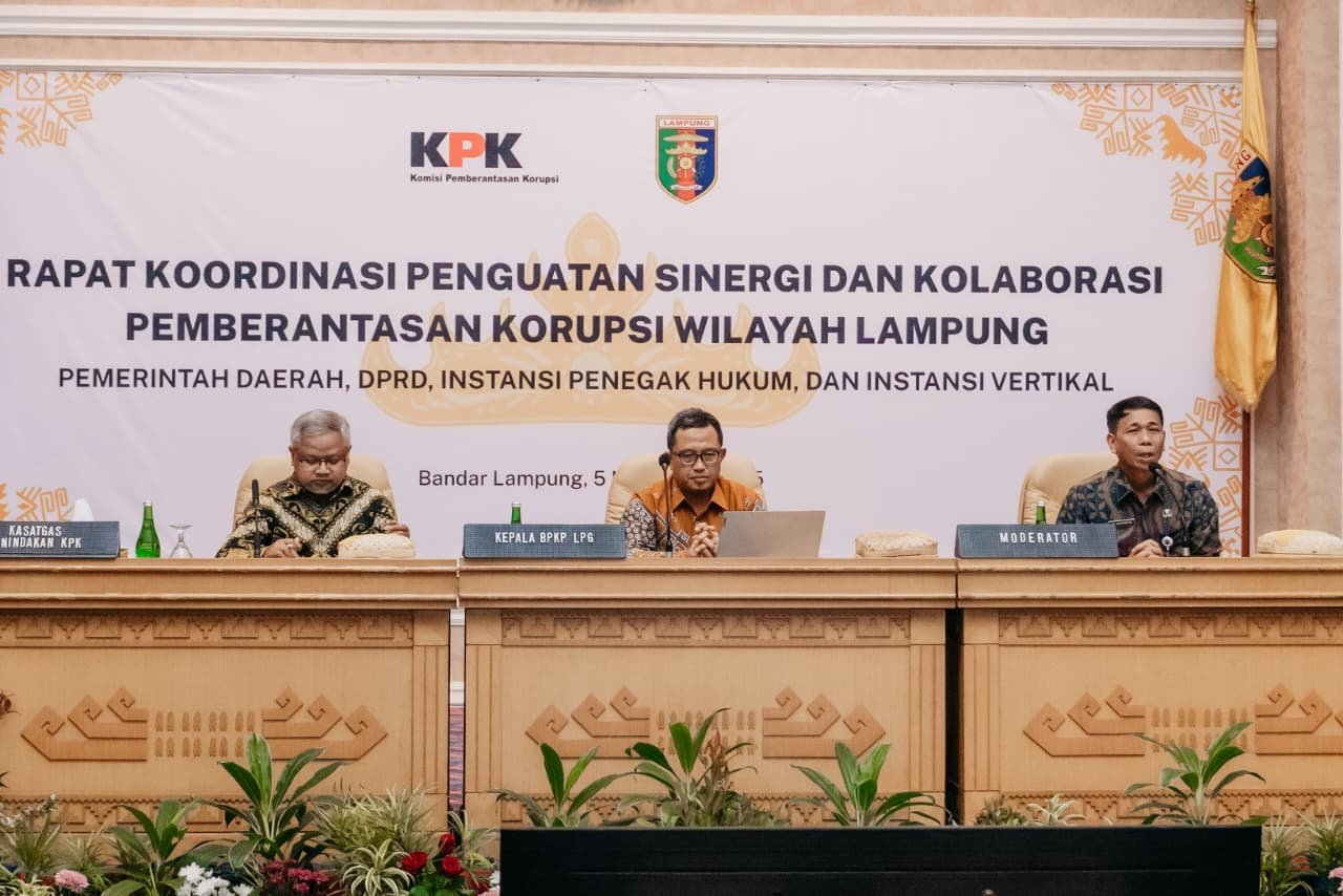 PODIUM, BANDARLAMPUNG, – Sekdaprov Marindo Kurniawan menghadiri Rapat Koordinasi Pemberantasan Korupsi Area Pengadaan Barang dan Jasa, di Balai Keratun Lt. III, Rabu (5/11/2025).